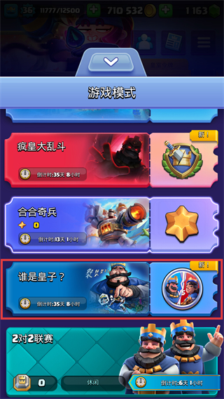 1、在游戏模式界面选择【谁是皇子?】模式,其倒计时35天8小时较长,可长期参与该趣味玩法积累奖励。