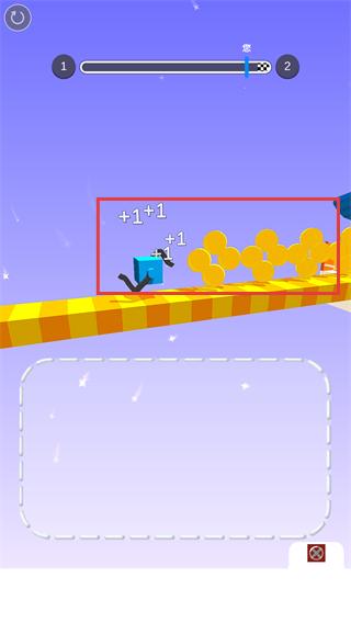 3、遇到金币区域时,操控角色移动至【红框内的金币处】,获取【+1+1】的奖励,积累关卡积分。