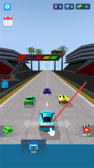 1、进入游戏界面后,长按【长按开车】按钮,可操控车辆启动并参与竞速比赛,同时可查看界面中的资源与功能入口。