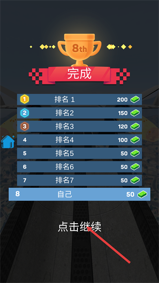 4、比赛结束后,会显示排名及对应的奖励,点击【点击继续】按钮,可结算奖励并进入后续游戏流程。