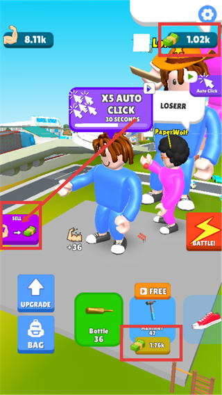 1、先点击【SELL】按钮出售肌肉,能拿到【1.02k】资源,还能触发【X5-AUTO-CLICK】增益,30秒内收益直接翻番哦。