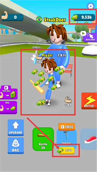 3、双线成长玩法设计:既可专注点击训练积累肌肉,也能参与跑酷挑战获取额外奖励金币。