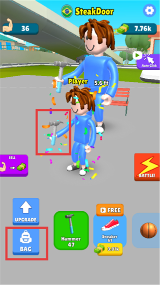 3、装备【Hammer】后点击【BAG】按钮,能打开背包管理道具,这样后续切换装备会更方便,角色发育节奏更顺啦。