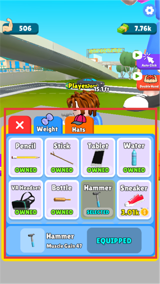 4、在背包界面选择已拥有的【Hammer】并装备,它能提供【Muscle-Gain-47】的属性加成,让角色战力直接拉满,闯关超轻松哦。
