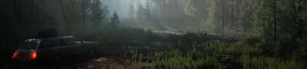 玩家驾驶一辆老式木质旅行车进入禁区,探索未知的区域,寻找资源和线索。
