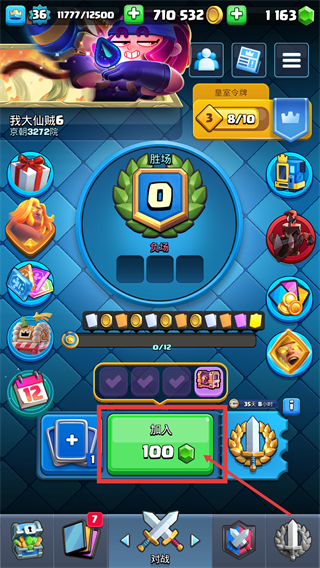 2、点击绿色的【加入100绿宝石】按钮进入挑战,这是参与终极挑战的必要步骤,准备开启对战之旅。