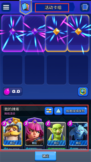 4、在卡组界面选择【我的牌库】,可按竞技场排列调整卡组,搭配合适卡牌提升挑战胜率。