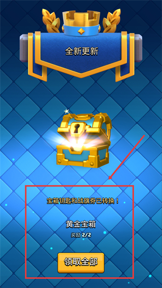 1、更新后点击【领取全部】获取【黄金宝箱】奖励,宝箱钥匙与战旗券已转换,助力资源积累。