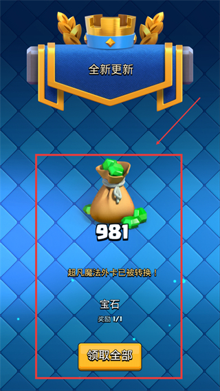 4、更新后领【宝石】奖励,超凡魔法外卡已转换,点【领取全部】快速获取提升储备。