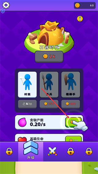1、在【石器时代】界面,先点击【食物产能】的增益按钮提升收益,已解锁【村民】,也可消耗金币解锁【矛兵】【棍棒手】。