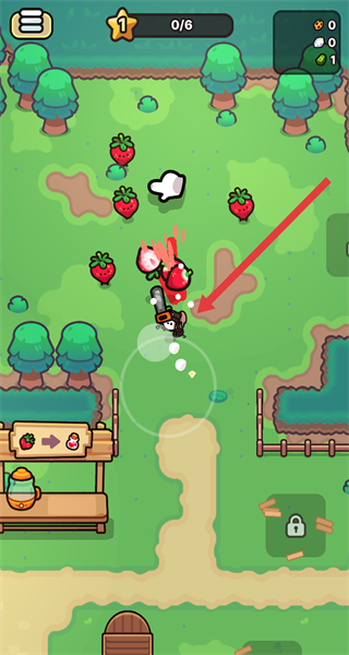 1、滑动屏幕操控角色移动到水果区域,使用电锯收割水果原料。