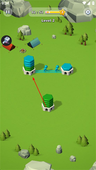3、拖动后蓝色模块会延伸路径,使对应小人移动至目标建筑完成该关卡的堆叠任务。