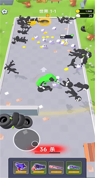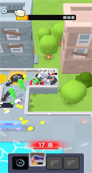4、传送后遇到绿色丧尸目标,操控角色靠近并使用武器发起攻击,击败丧尸可完成关卡目标,积累游戏资源。