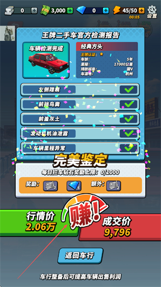 4、完成车辆检测如外观、发动机等项目,获取鉴定结果,通过行情价与成交价的差价赚取利润,点击返回车行推进流程。