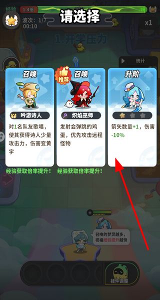 2、出现的选项中选择合适的操作,比如给已有的单位升阶,升阶后单位会获得属性变化,助力后续更高效地应对怪物攻击。