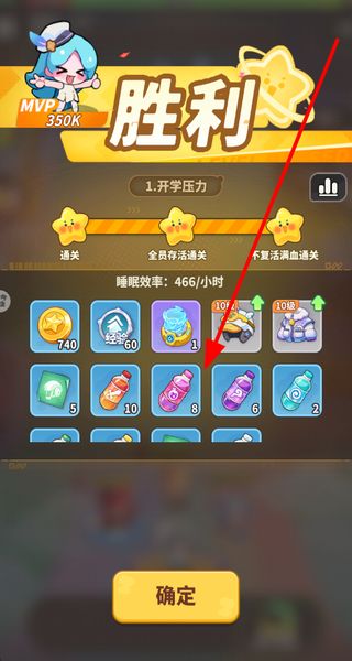 4、成功通关关卡后,会进入结算界面,界面会展示获得的各类奖励,点击确定按钮即可领取这些奖励,结束当前关卡流程。