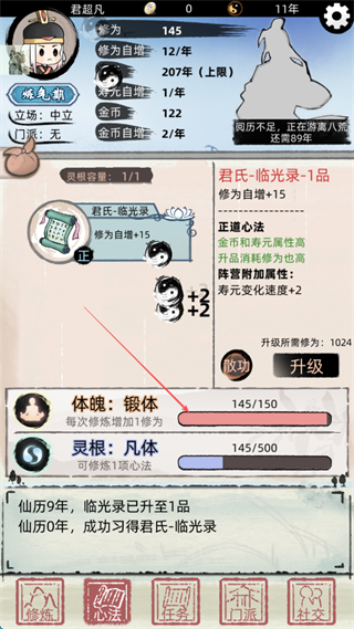 1、获得君氏-临光录心法,其提供修为自增等属性加成,助力修仙进程。