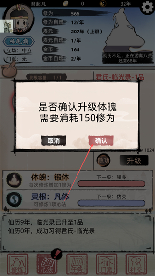 4、在弹窗中点击确认,消耗修为升级体魄,提升自身属性。