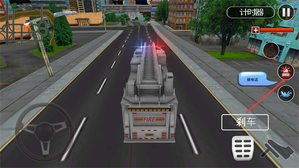 4、到达火灾现场后,点击右侧的喷水按钮,对准火焰区域进行喷水操作,即可完成本次消防救援任务。