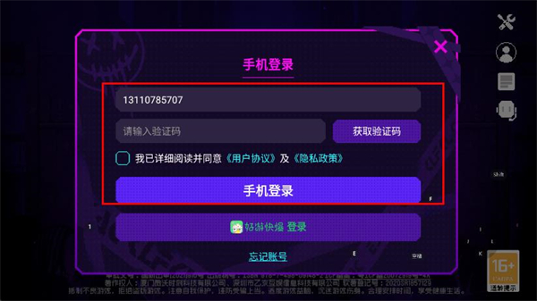 4、在手机登录页面,输入目标账号的手机号、验证码,勾选协议后点击手机登录,完成账号切换。