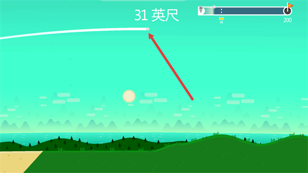 3、击球后观察球的飞行轨迹,当前显示【31英尺】为击球距离,需向【200英尺】的目标距离推进。