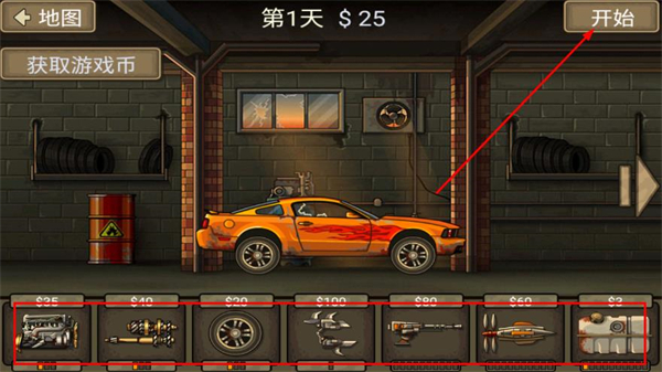 2、选择发动机、轮胎等配件组装战车,点击右上角开始进入关卡。