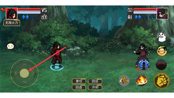 4、点击右侧的忍术、攻击按钮释放技能,与AI对手进行对战演练。