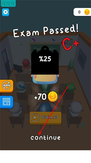 4、成功作弊后成绩会提升,完成关卡后点击continue即可进入下一关。