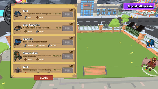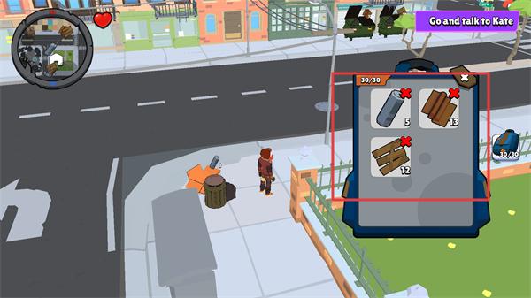3、移动至街道区域后,与场景中的物品(如垃圾桶)交互,可获取道具(如金属罐、木板),这些资源会自动存入右侧背包。