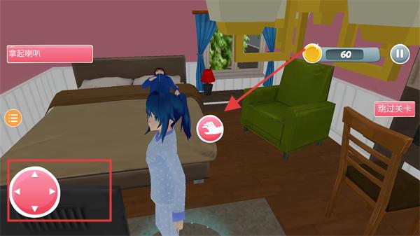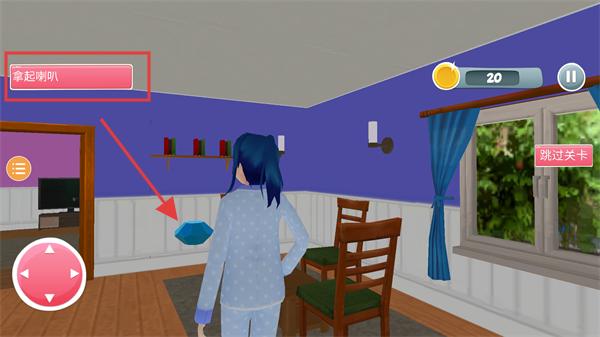 2、在场景中通过方向按钮移动角色,找到目标物品(如蓝色喇叭),同时可点击【拿起喇叭】完成物品收集。