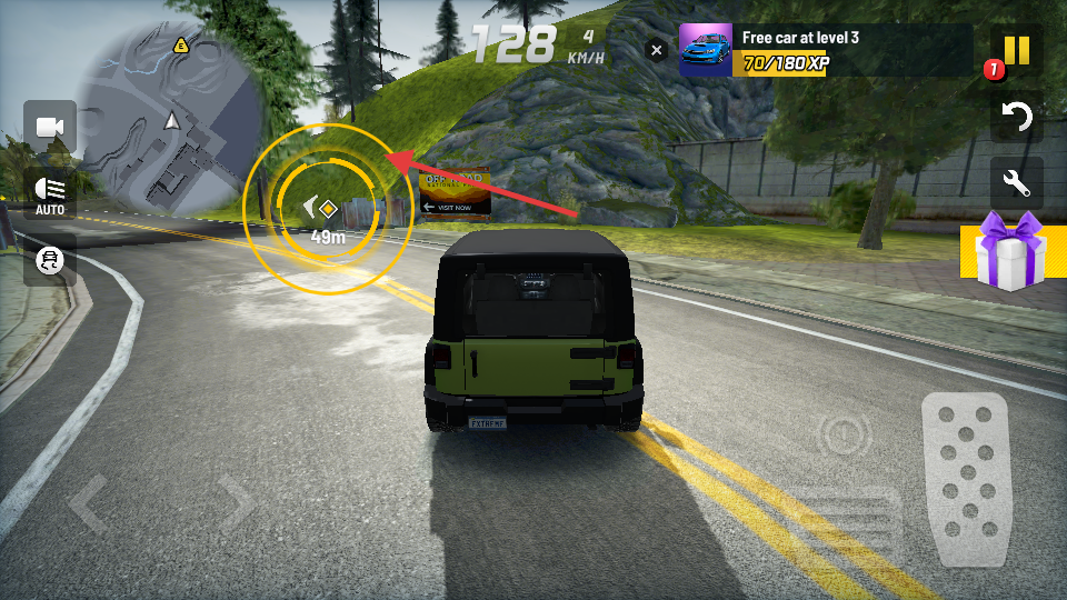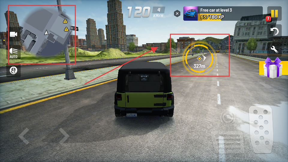 3、驾驶时利用左侧的方向按钮控制车辆转向,注意左上角的小地图和前方的任务距离提示。