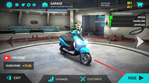 1、车库界面点击右下角【RIDE】,进入模式选择页面。