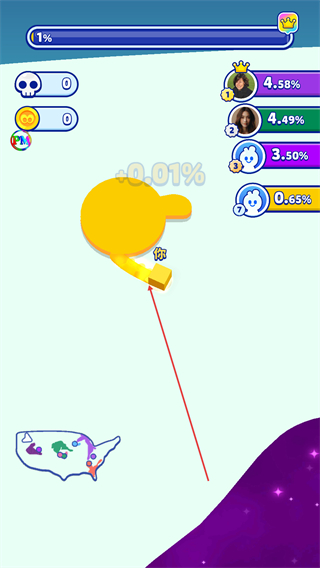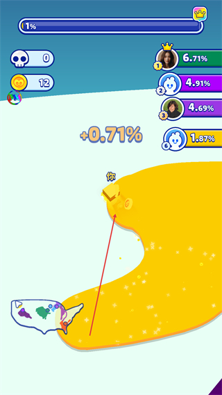 1、操控黄色纸片移动,占据区域积累进度至1%,同时观察排行榜排名,推进游戏。