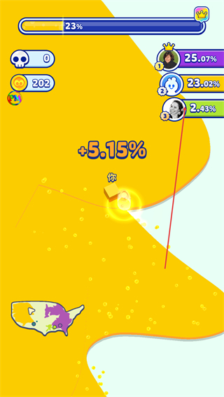4、快速扩张区域,进度跃至23%,金币增至202,大幅提升占据比例,提升排名。