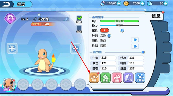 2、在精灵界面中找到要升级的宝可梦,点击EXP 升级按钮。
