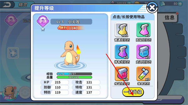 3、在提升等级界面选择经验药,点击一键升级完成等级提升。