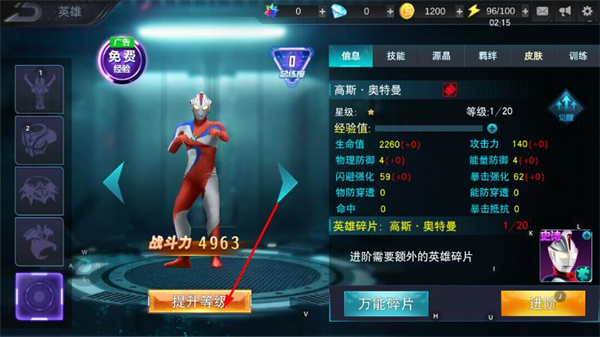 3、在英雄界面点击提升等级,消耗资源快速提升该奥特曼的等级。