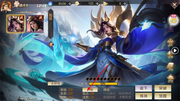 2、在武将界面中,选中目标武将,点击升级,打开升级道具选择界面。