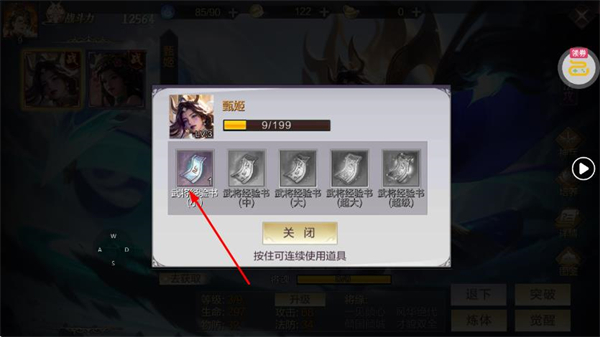 3、在升级道具界面里,选择武将经验书类道具,使用后即可提升该武将的等级。
