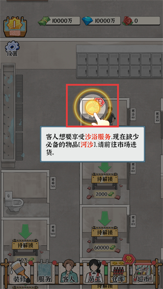 1、根据提示,客人需要洗浴服务却缺少物品,点击对应区域后前往【市场】进行进货,满足服务所需物资。