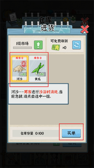2、在【仓库进货】界面,选中【河沙】急需品,点击【买单】完成采购,补充浴场物资。