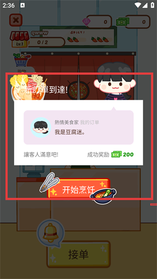 2、新订单到达后,点击【开始烹饪】按钮,查看客人需求为【我是豆腐迷】,准备按要求制作美食。