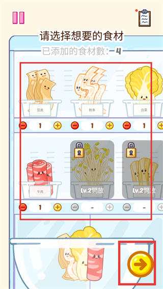 3、在食材选择界面,选择【豆皮】-【粉条】-【白菜】-【牛肉】各1份,确保已添加食材数达标。