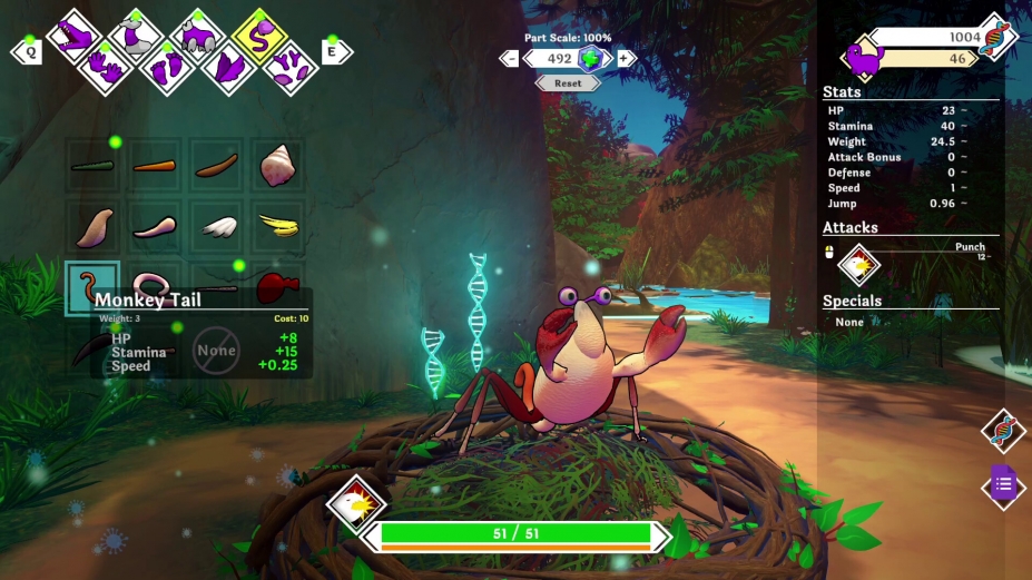 击败其他生物后可获取它们的DNA碎片,用于解锁新的身体部件。游戏提供了7个部位槽位和超过40种不同的生物供玩家发掘,组合方式多达一千万种以上。玩家需要根据实际需求选择合适的部件进行装配,比如增强攻击力或提升移动速度,以应对不同场景下的挑战。