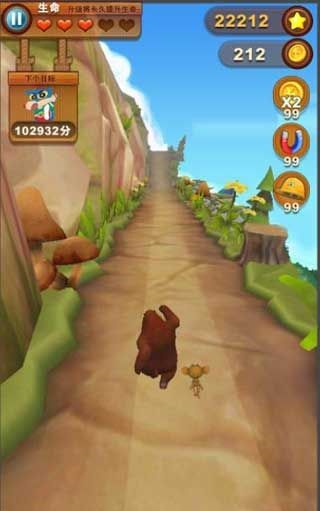 游戏操作简单,跟普通的跑酷游戏差不多,玩家只需向上滑动屏幕,便可控制熊大跑动或者跳跃,越到低障碍时,向下滑动屏幕,便可操控熊大向下滑行躲避障碍。简单的操作,玩法却充满了挑战,一路将会不断出现各种障碍,在躲避它们的同时,还要尽可能的吃到沿路的金币,但是金币虽好,可不要贪心哟,学会避重就轻才是跑酷游戏的关键,如果光想着吃金币而忽略了一路的障碍,撞击费血,那就得不偿失了。