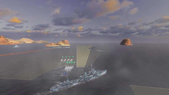 2、但是距离敌方数公里甚至十几公里时,想要准确命中并非易事,鱼雷发射也需要预判。让各位舰长目测心算显然不可能,这时就需要用到游戏中的鱼雷预判辅助功能,让你轻松瞄准,在锁定敌方战舰之后,瞄准辅助随即出现(白色扇区),只需要将发射扇区对准预瞄扇区,便可发射。