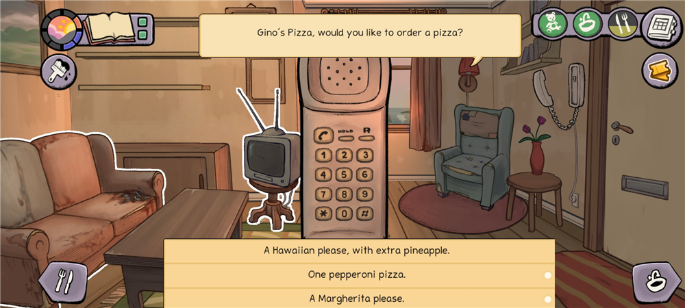 1、点击门旁边墙上的电话,选择第一个披萨的图标就可以开始点披萨外卖了,也能打电话给那你之后的朋友。