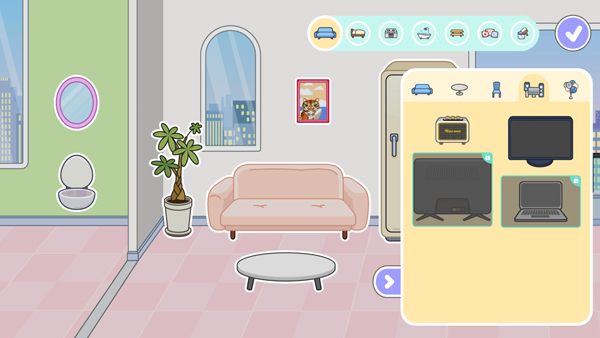 4、打造好后进入,玩家可摆放各种家具,如沙发、桌子、电视、床等;