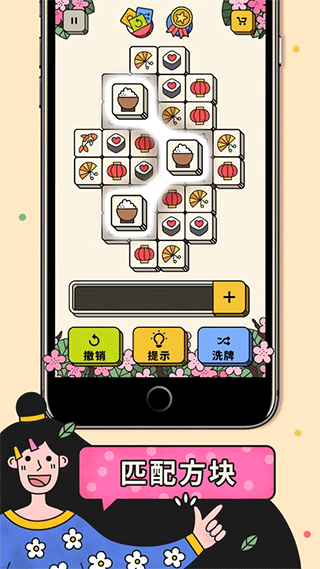 玩法:只需点按即可将方块放入堆槽中。三个相同的方块(例如三个草莓)即可匹配消除。