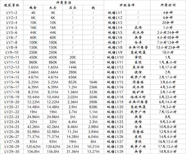 战火与秩序城堡升级条件大全 1-30级城堡升级资源表